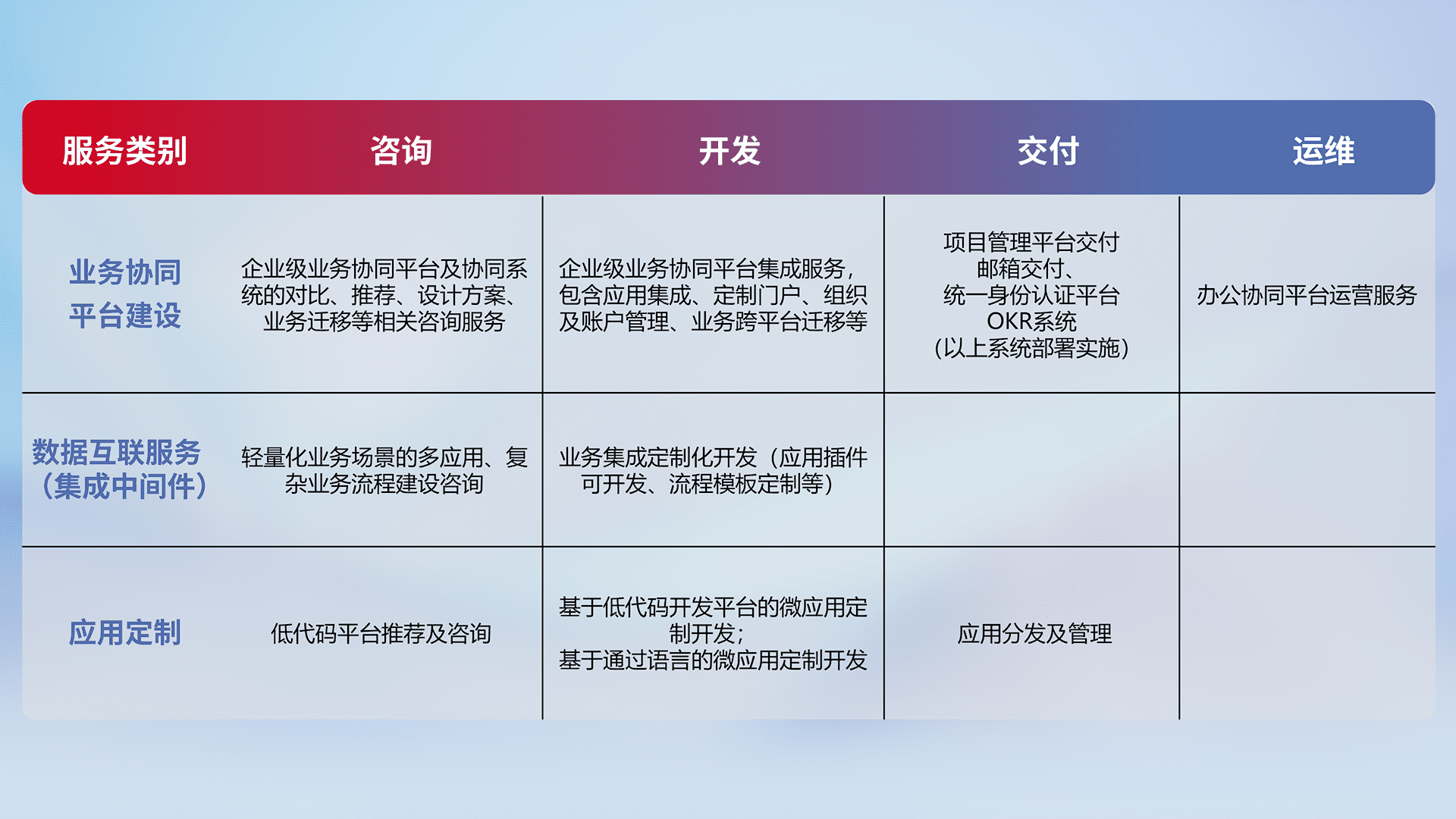 针对钉钉、、、、企微、、、IDaas等平台级产品提供产品的规划、、、方案、、、、交付、、定制化开发等服务,,实现如统一协同办公、、、智能客户服务、、、、混合会议管理、、智能数据查询、、等业务场景,,,实现数字化转型。。